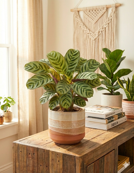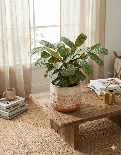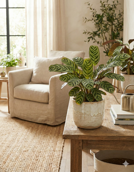 Comme toutes les calatheas, elle est une plante priante : ses feuilles bougent subtilement entre le jour et la nuit, apportant une présence végétale apaisante.