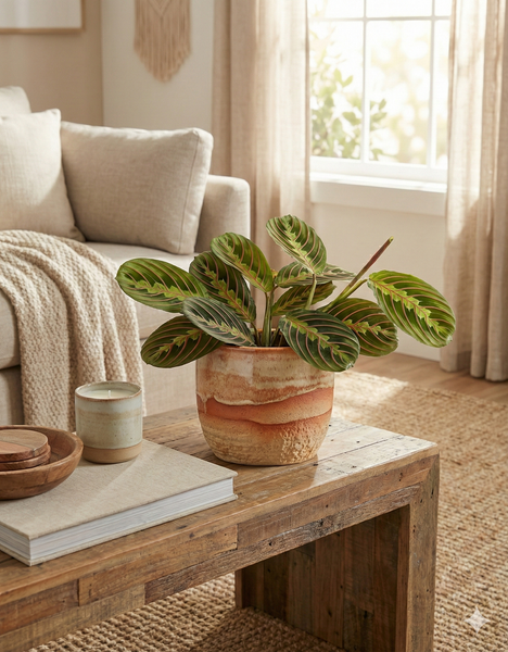 Comme toutes les marantas, elle est vivante et mouvante : ses feuilles se replient le soir et s’ouvrent le matin, offrant un spectacle végétal doux et apaisant, idéal pour créer une atmosphère zen et chaleureuse.