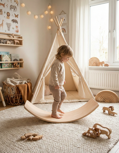 La Balance Board est bien plus qu'un simple accessoire en bois : c'est un outil de jeu ouvert (Open-ended play) qui grandit avec votre enfant et s'adapte à toute la famille. Inspirée des pédagogies actives comme Montessori et Waldorf, elle stimule l'équilibre, la coordination et la créativité sans jamais imposer de règles.